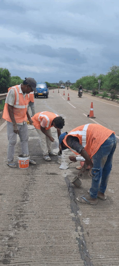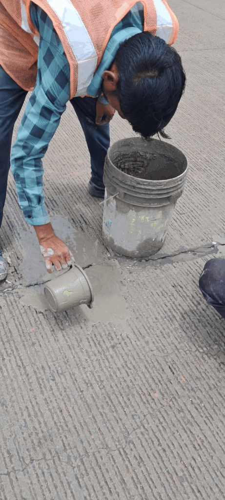 पूछने पर उसके सुपरवाइजर ने बताया कि इस सड़क के फटे हुए हिस्से में नीचे कैविटी डेवलप हो गई है जिनको सीमेंट घोलकर भरा जा रहा है उसके बाद ऊपर से ईपॉक्सी भरी जाएगी । या फिर लोहे के यूक्लिप् ठोकर सड़कों को फटने से रोका जाएगा। ताजुब की चीज है की लगभग पूरी सड़क ही फट चुकी है यानी धीरे-धीरे करके पूरी सड़क का कंक्रीट बदलना पड़ सकता है
